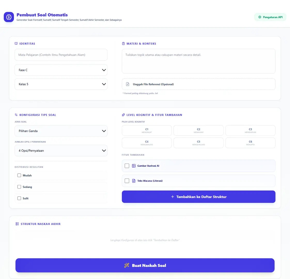 - 📑 Multi-Format Export: Hasil soal bisa langsung diunduh ke format Word (DOCX), PDF, atau langsung di-copy ke Google Form & Quizizz.